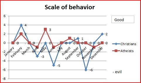 I submit that my fictional chart is not too far from the truth. I also submit that atheists are more stable than Christians, hence the low showing among the prison ranks. I submit that Christian morality swings wildly and frequently. I think this explains much of Christian history. While the atheist is at the coffee house sipping a cup of joe, the Christian is fretting over some incident where they may have displeased God in some slight fashion. While the atheist may not be a shining example of a human being in all cases, a Christian has no room to brag, especially when speaking from a prison cell.