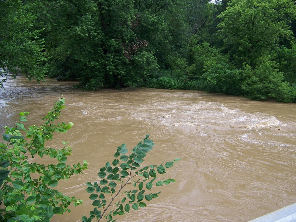 This picture, taken at Pleasant Hill Dam shows a level of 66 feet. I was told this was 16 feet above the normal level. It was expected to rise another foot. Normally you would be able to see the openings where water would flow in.