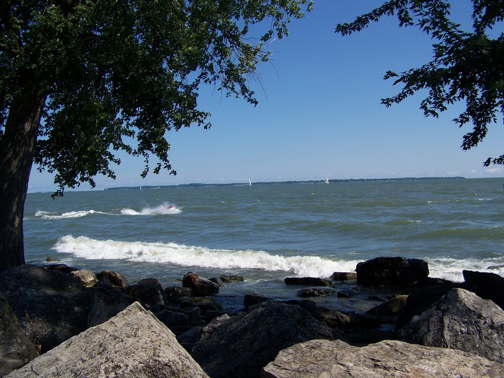 Although a nearby outcropping of rock obscures the island itself, Put-In-Bay’s Perry Monument is visible in the distance. Put-In-Bay, named after the bay, is also known as South Bass Island.